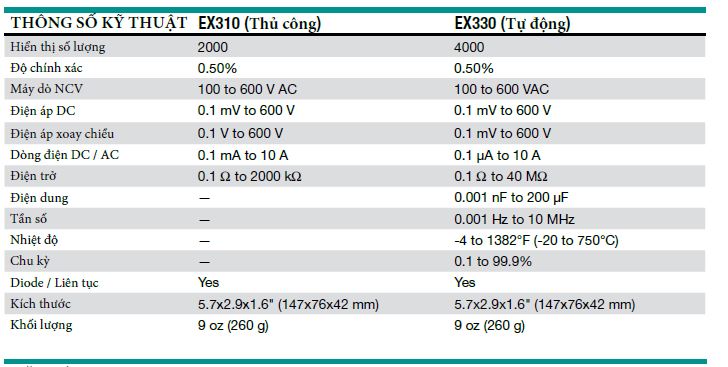 • Hoàn chỉnh với chân đế, dây dẫn thử nghiệm, bao da bảo vệ, pin, đầu dò nhiệt độ dây loại K đa năng (chỉ EX330)